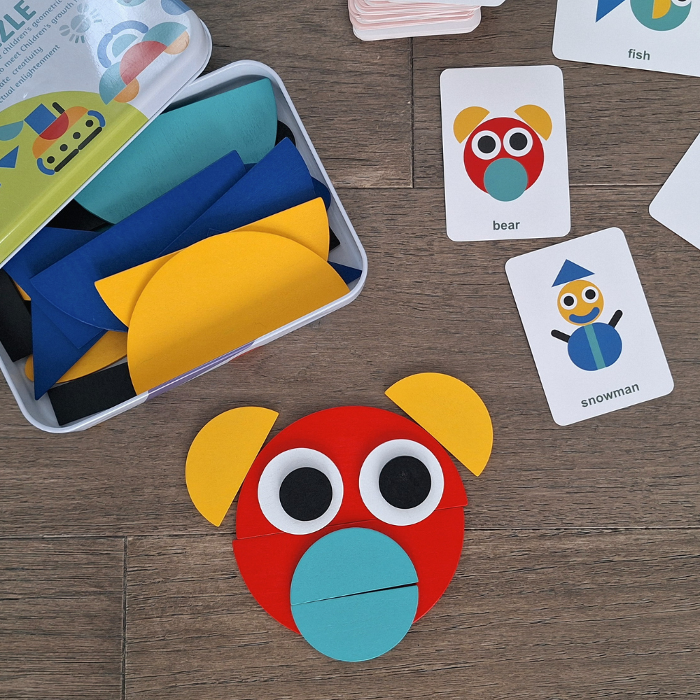 This wooden shape puzzle is such a great educational toy! The pieces are large and easy for little hands to grab and move around. It comes with lots of pattern cards to create different designs, which keeps it fun and engaging.