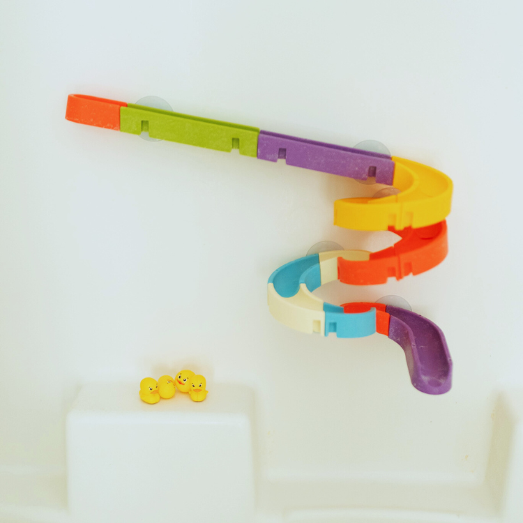 My son loves bath time — especially when he gets to play with this duck slide toy! At first, we helped him set up the track for the ducks, but now he can do it all by himself.